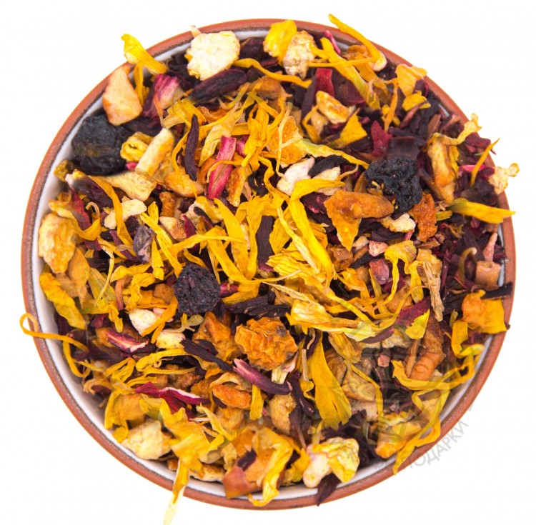 Каркаде, цедра апельсина, арония, яблоки, лепестки календулы, подсолнуха, аромамасло персика